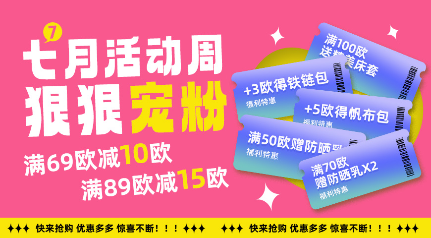 当前位置: 首页 > 优惠活动 > 开元亚超七月活动周,全场实付满69欧立减10欧(限时购产品不参与)全场实付满89欧立减15欧